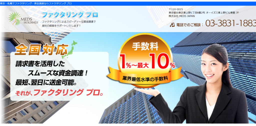 ファクタリングプロは、株式会社MEDS JAPAN が運営するファクタリングサービスで、売掛金の前倒し現金化を支援しています。オンライン対応で、最短翌日入金をうたっている媒体もあります。