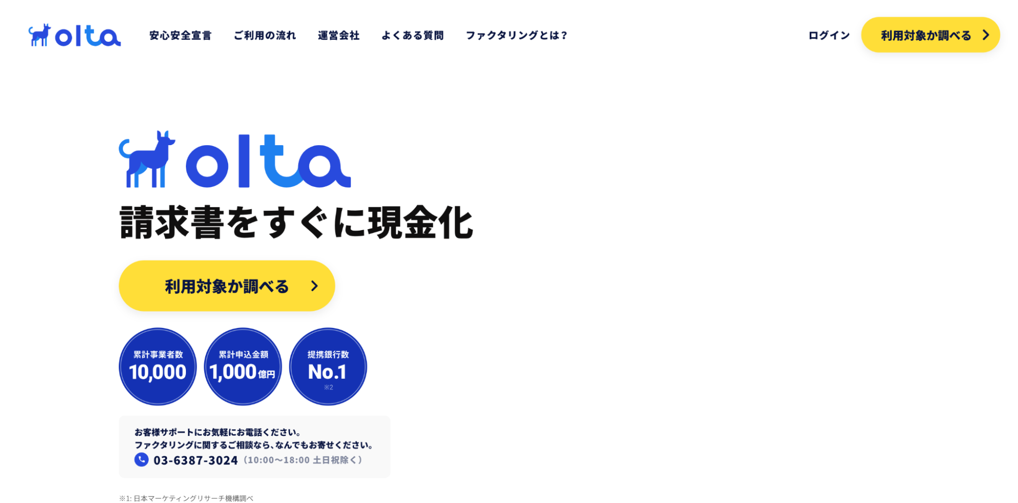 | OLTA | 2社間 | 2%~9% | 最短即日 | 無制限 | OLTA公式HP |