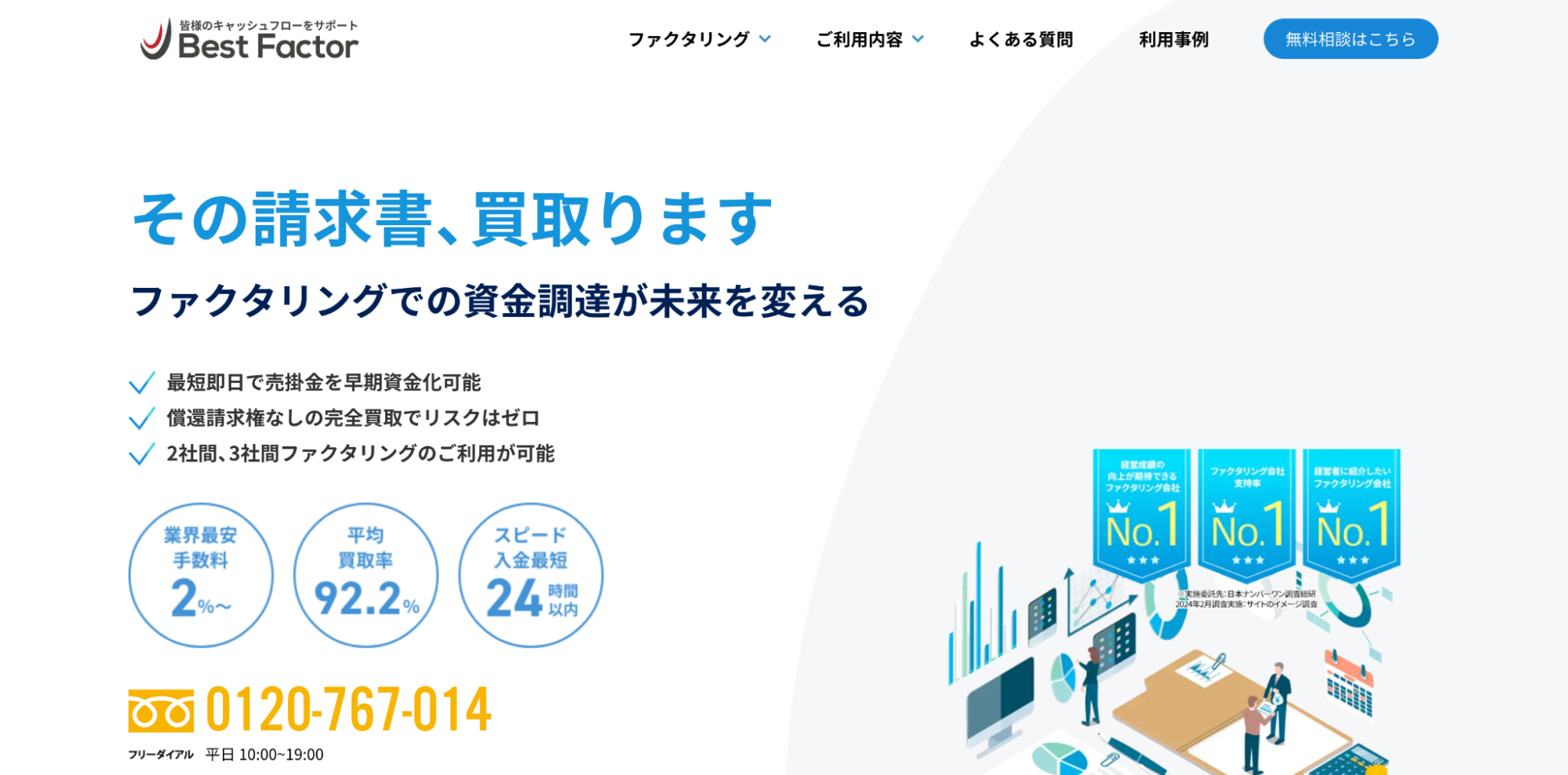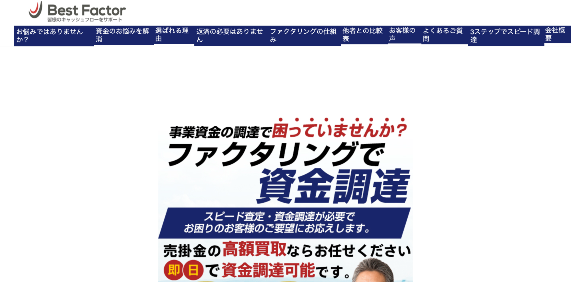 | ベストファクター | 2社間・3社間 | 2~20% | 最短即日 | 30万円~1億円 | ベストファクター公式HP |