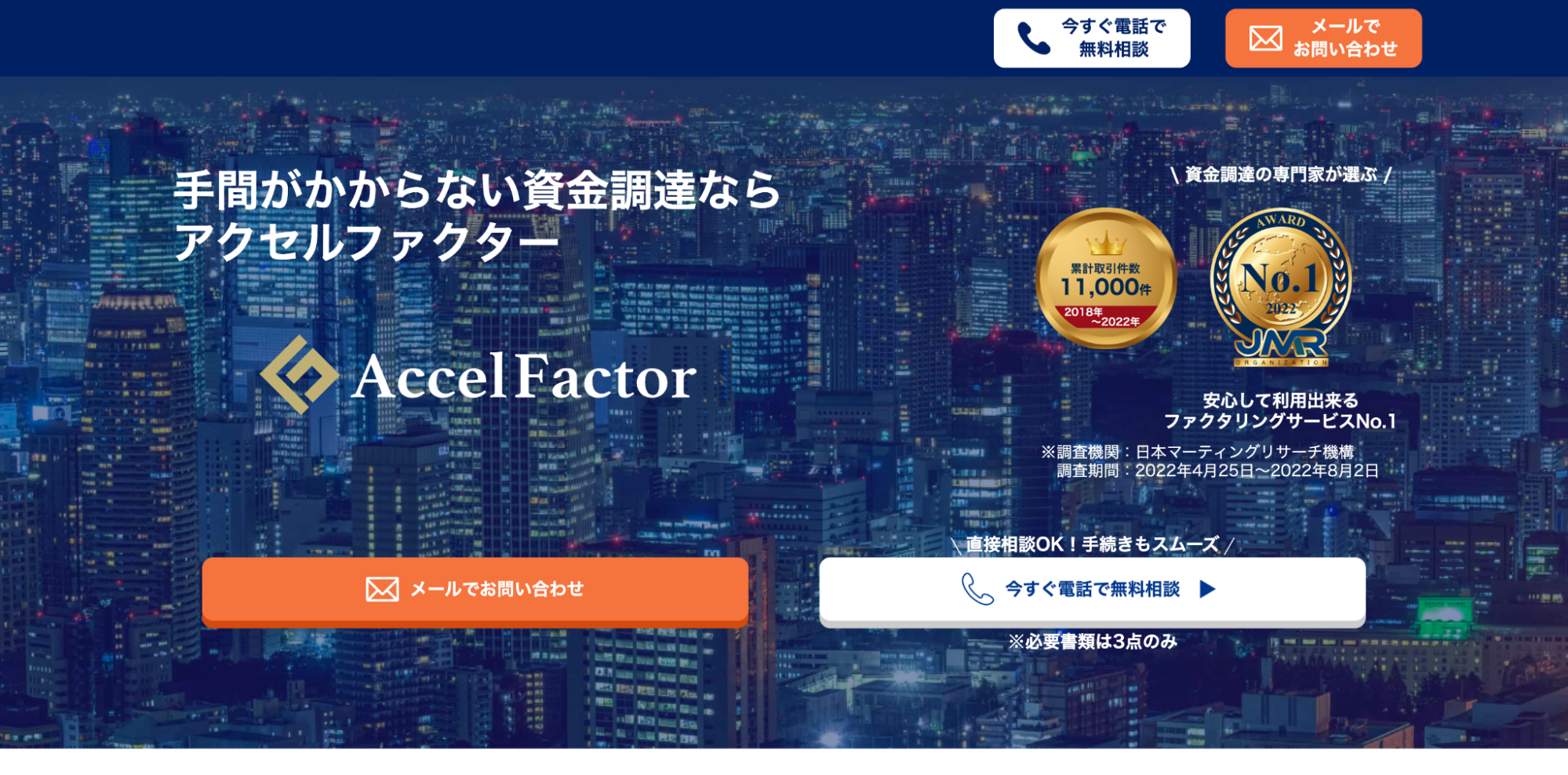 | アクセルファクター | 2社間・3社間 | 0.5%~ | 最短即日2時間 | 非公開 | アクセルファクター公式HP |
