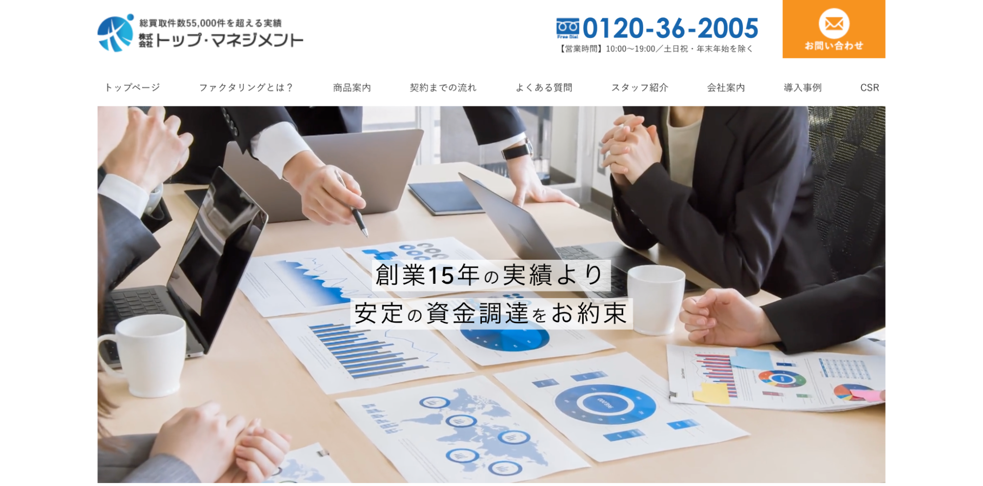 | トップ・マネジメント | 2社間・3社間 | 0.5%〜12.5% | 最短即日 | ~1億円 | トップ・マネジメント公式HP |