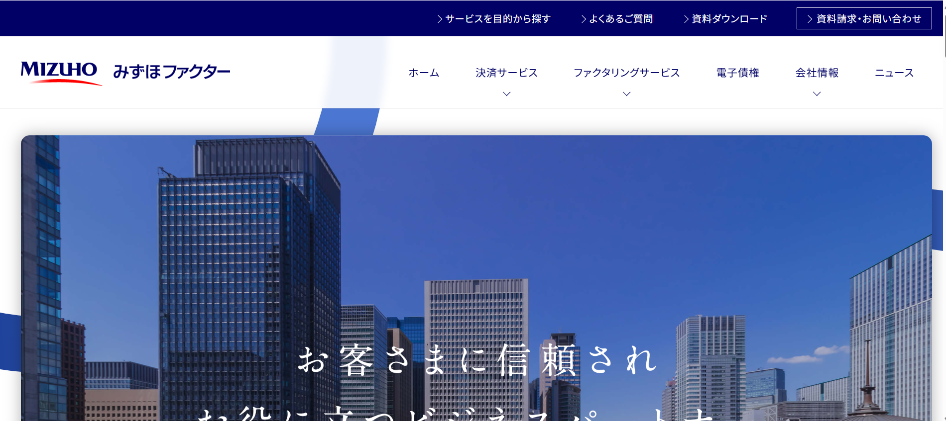 みずほファクターは、国内・国際ファクタリングを含む売掛債権関連サービスを展開する法人向け会社です。国内では販売先ごとの回収保証サービスがあり、保証対象とした売上債権を保証限度額内で100%保証しています。
