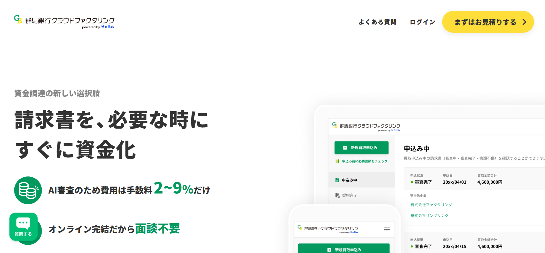 群馬銀行はOLTAと共同で、「群馬銀行クラウドファクタリング powered by OLTA」を提供しています。企業が保有する売掛債権(請求書)をオンラインで売却し、期日前に運転資金として現金化できます。