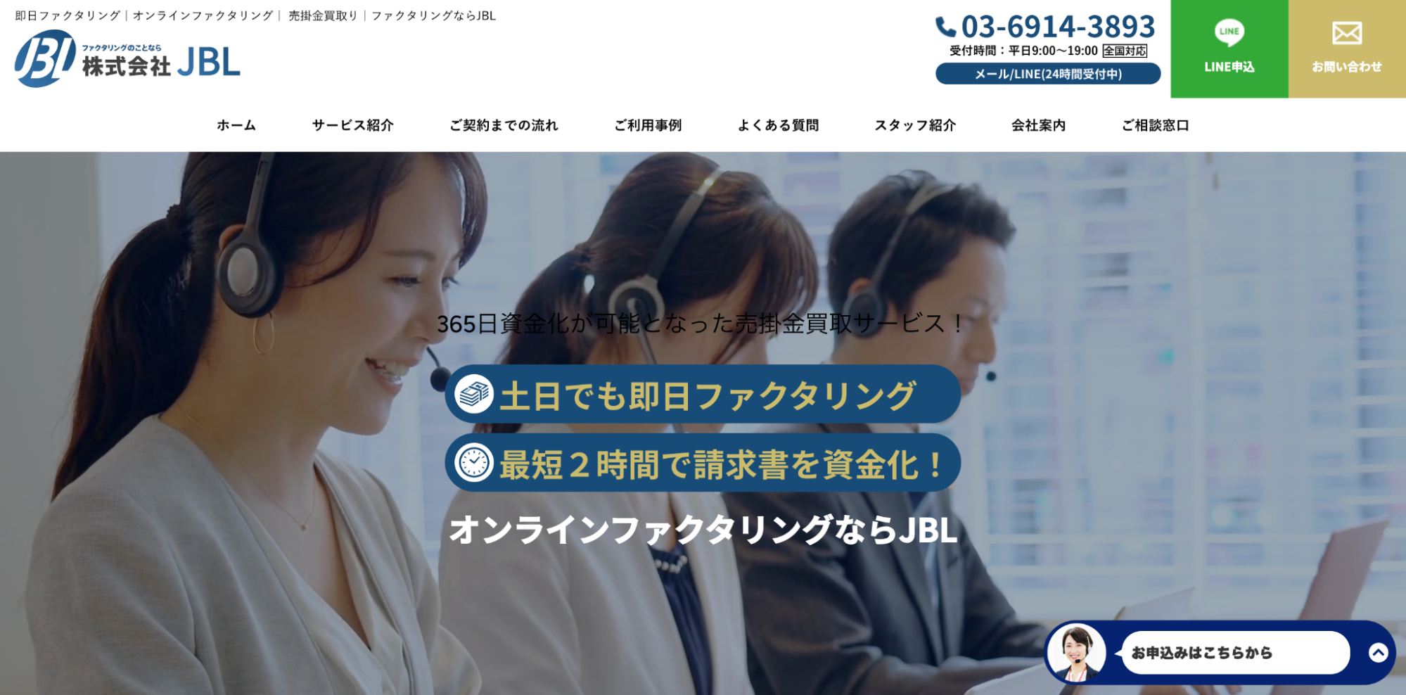 JBLは、迅速かつ柔軟な対応を特徴とするファクタリング会社です。中小企業を中心に幅広い業種に対応しており、利用実績が豊富です。