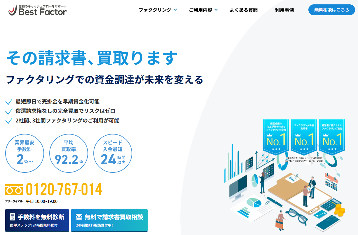 ベストファクターは、「資金調達の最後の砦」として、多くの企業から支持を集めるファクタリング会社です。審査スピードの早さに定評があり、書類がそろっていれば最短で当日入金も可能です。