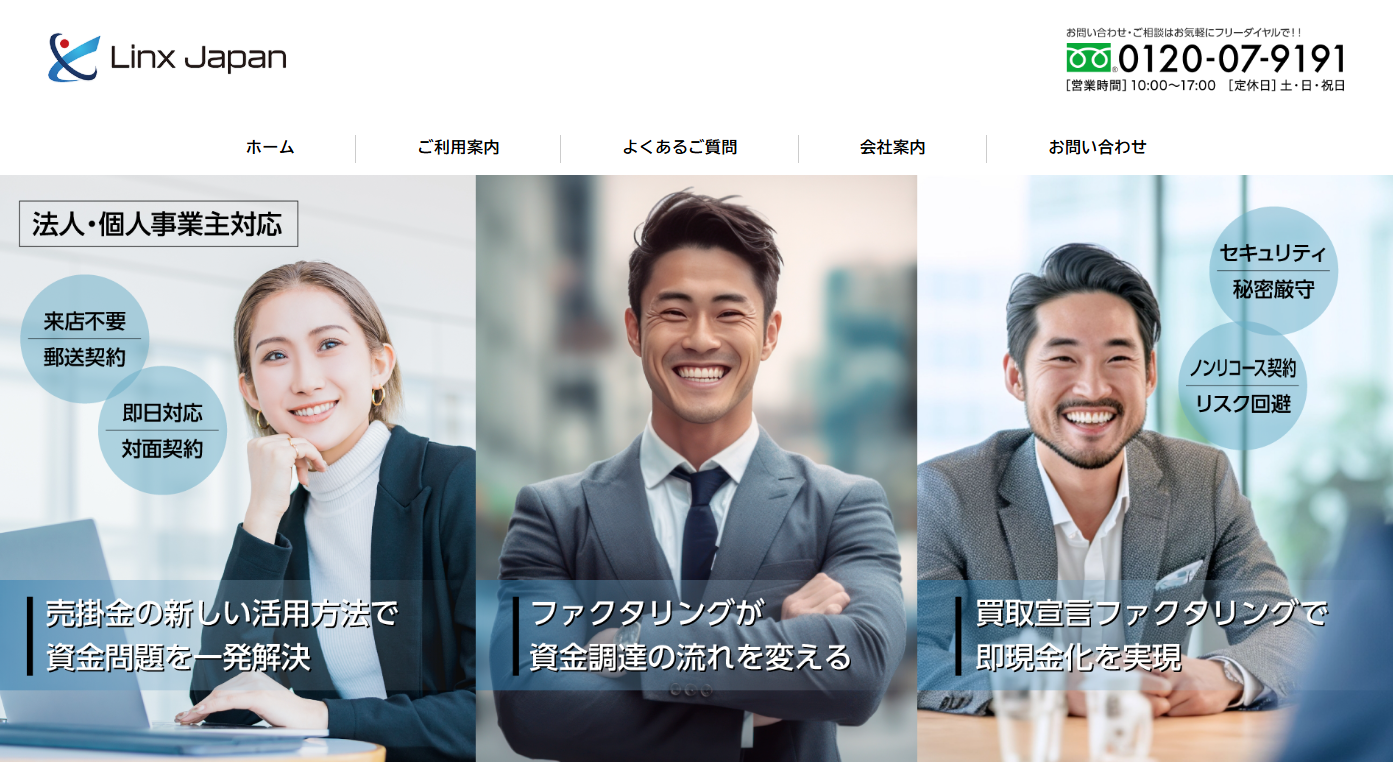 LinxJapanは、「資金繰りの悩みを最短1日で解消する」を掲げるスピード特化型のファクタリング会社です。東京・神奈川を中心に、関東一円での即日対応に力を入れており、書類の準備さえ整えば即日の入金も可能です。