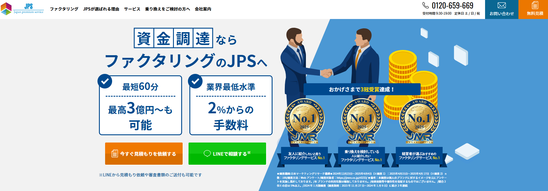 | JPS | 2社間・3社間 | 2%〜10% | 最短即日 | 〜3億円 | JPS公式HP |