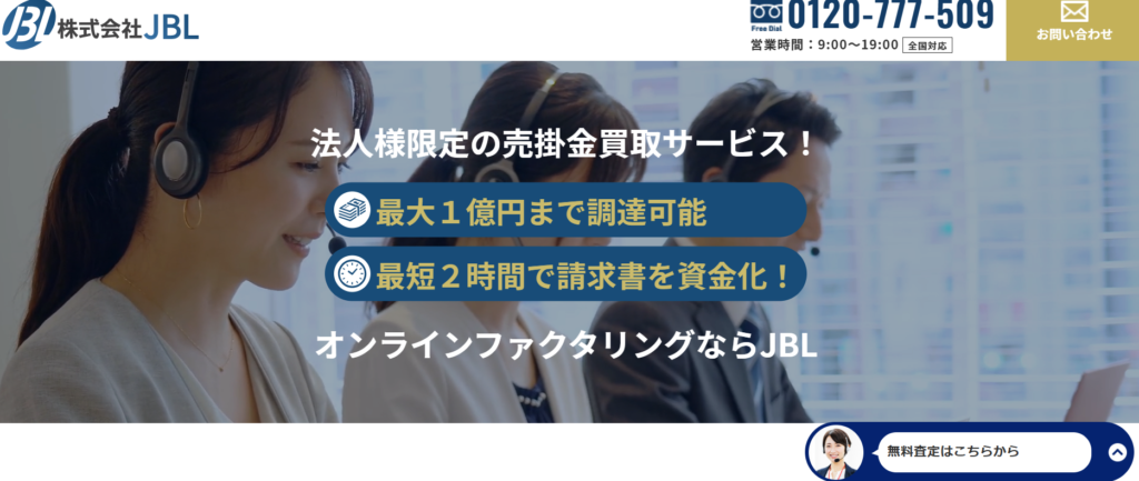 JBLはオンライン完結型の売掛金買取サービスで、Webで全国24時間365日対応しています。独自の柔軟な審査と業界最速級のスピードが最大の特徴となり、最短2時間で資金化が可能です。