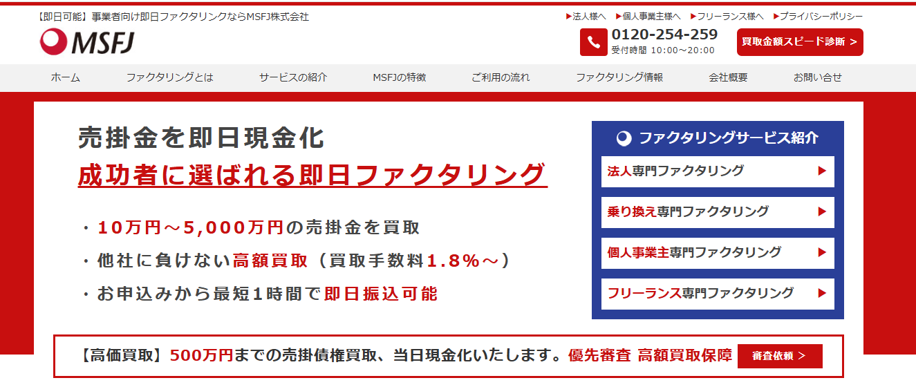 | MSFJ | 2社間・3社間 | 1.8%〜 | 最短即日 | 10万円〜5,000万円 | MSFJ公式HP |
