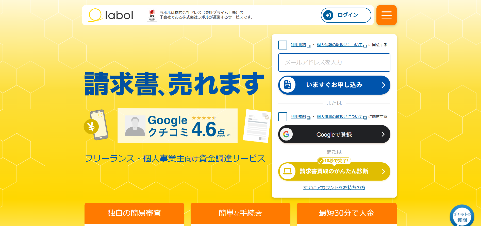 | ラボル | 2社間 | 10% | 最短即日30分 | 1万円~ | ラボル公式HP |