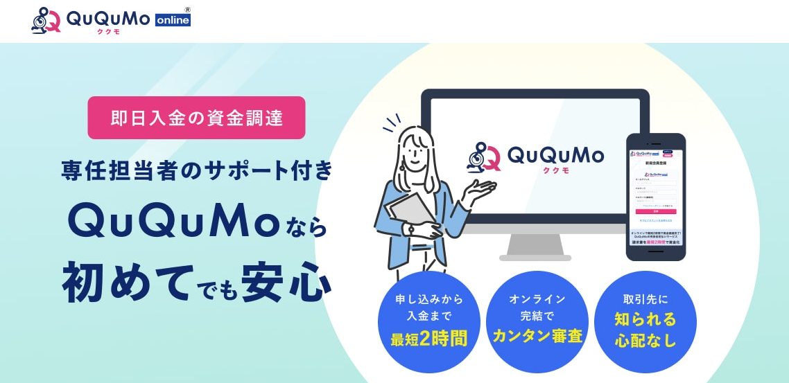 | QuQuMo(ククモ) | 2社間 | 1%〜 | 最短2時間 | 上限なし | QuQuMo(ククモ)公式HP |