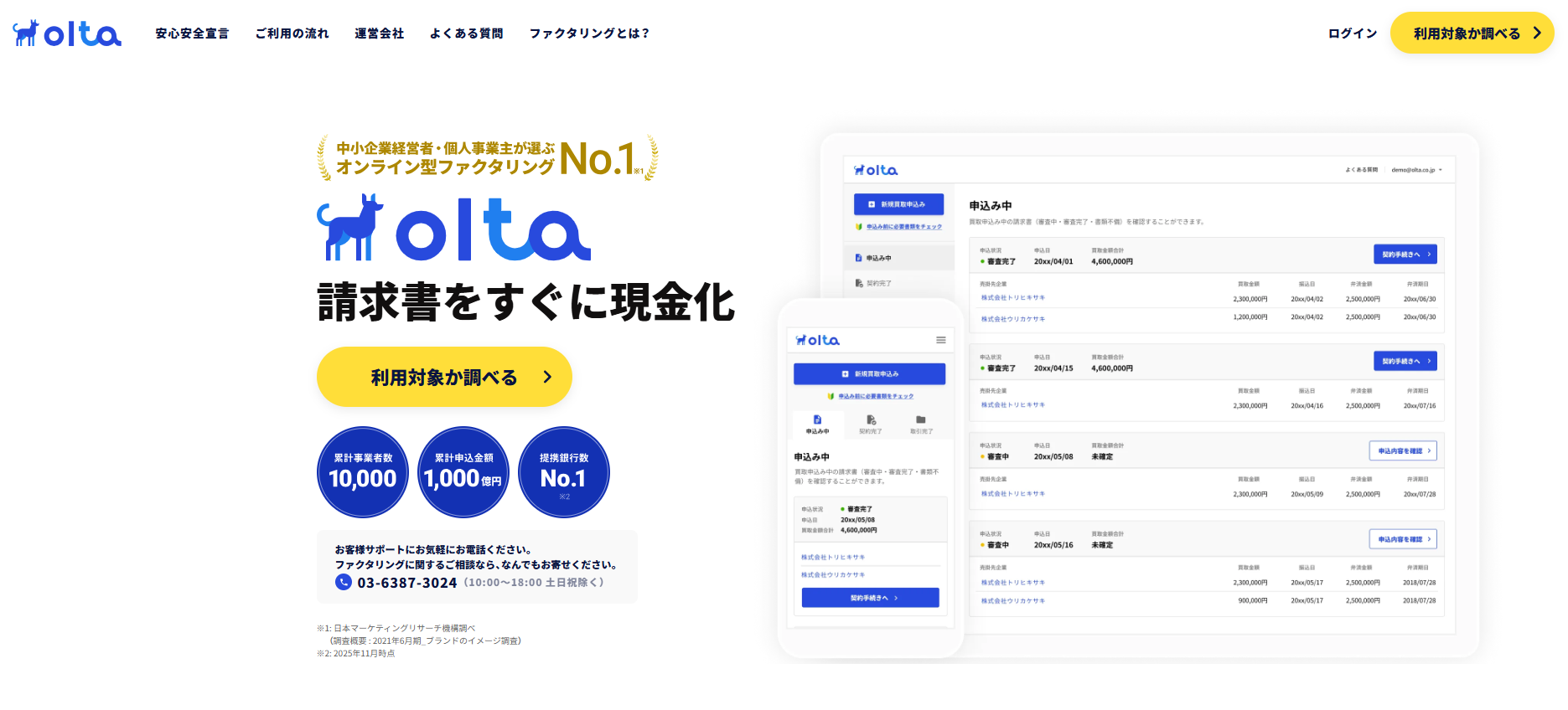| OLTA | 2社間 | 2%〜9% | 最短即日 | 無制限 | OLTA公式HP |