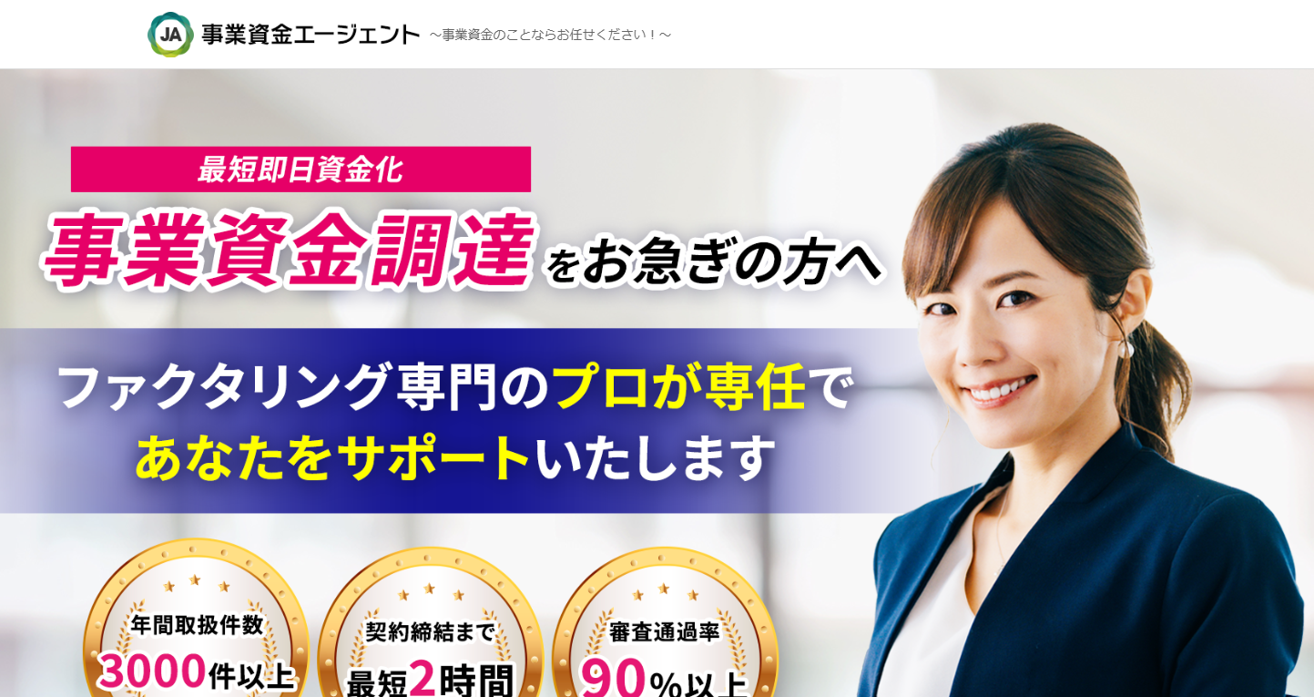 | 事業資金エージェント | 2社間 | 1.5%〜 | 最短2時間 | 10万円〜2億円 | 事業資金エージェント公式HP |
