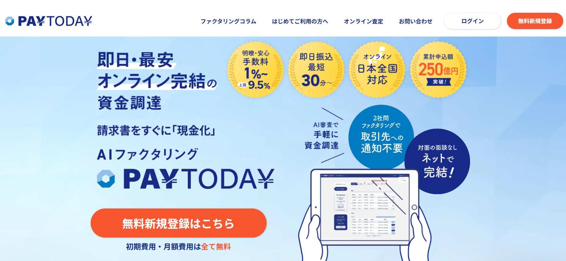 | PayToday | 2社間 | 1%〜9.5% | 最短30分 | 10万円〜上限なし | PayToday公式HP |