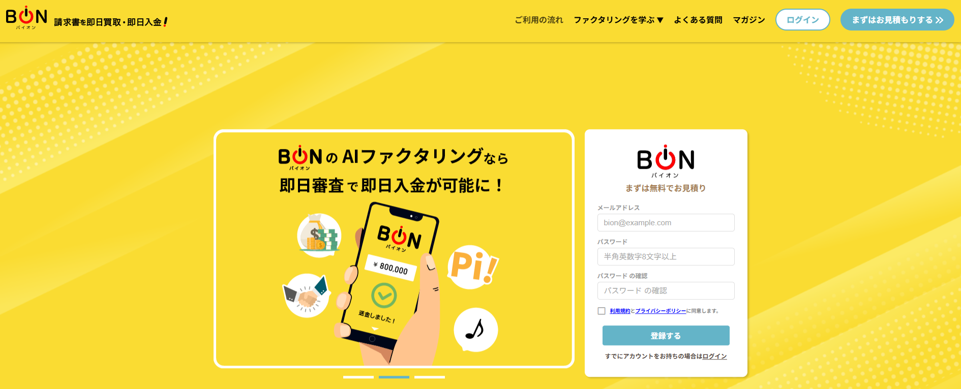 | バイオン | 2社間 | 10% | 最短60分 | 5万円〜 | バイオン公式HP |