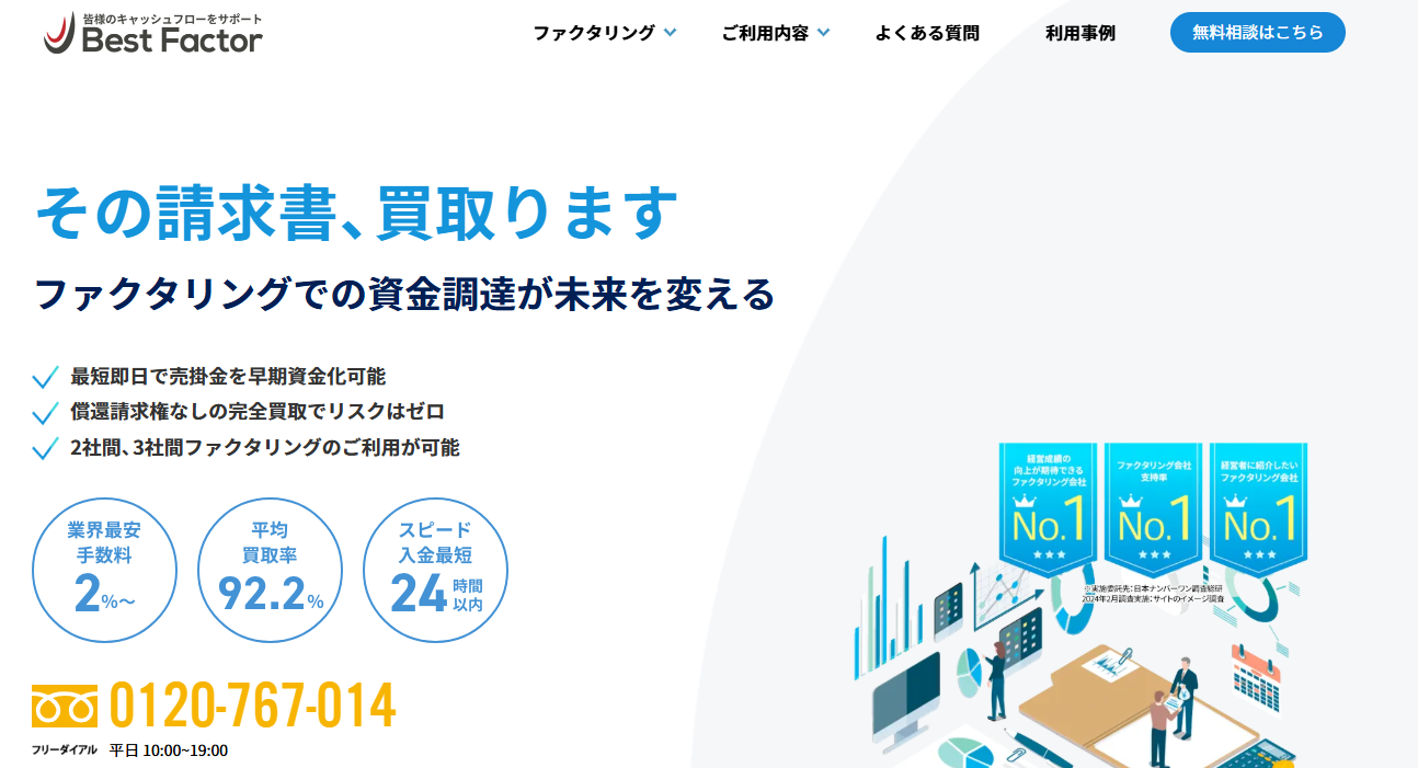 | ベストファクター | 2社間・3社間 | 2%〜 | 最短24時間以内 | 30万円〜1億円 | ベストファクター公式HP |