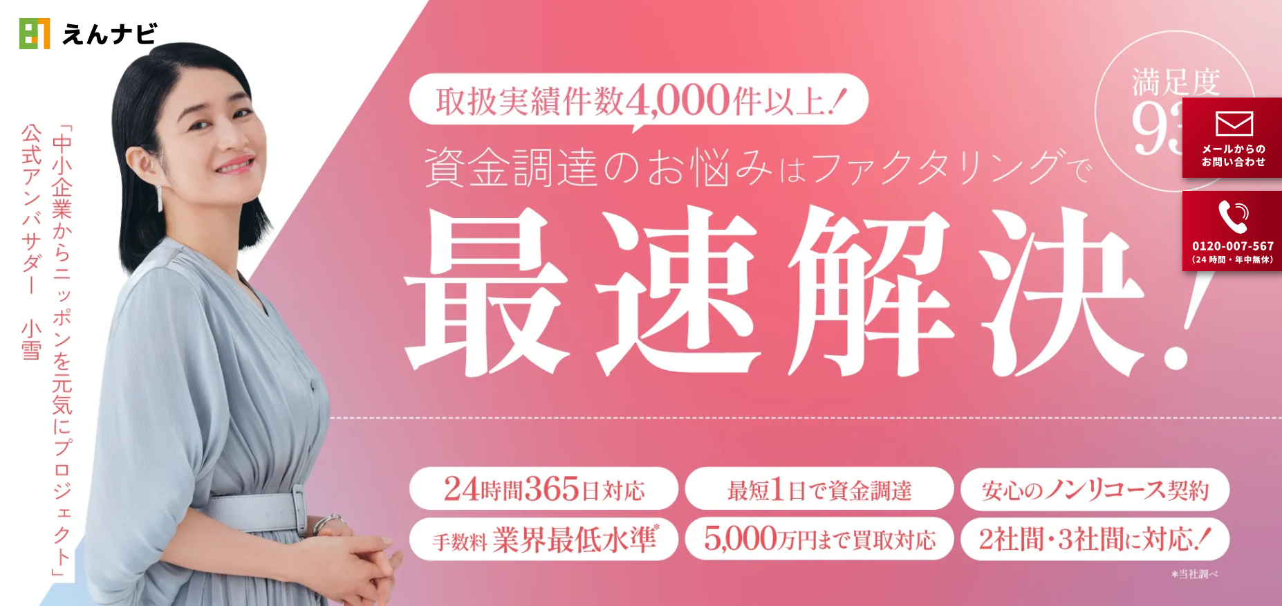 えんナビは、株式会社インターテックが運営するファクタリングサービスで、取扱実績4,000件超、顧客満足度93%以上となっています。売掛債権を最短1日で現金化し、24時間365日の受付体制で急な資金需要にも対応可能です。