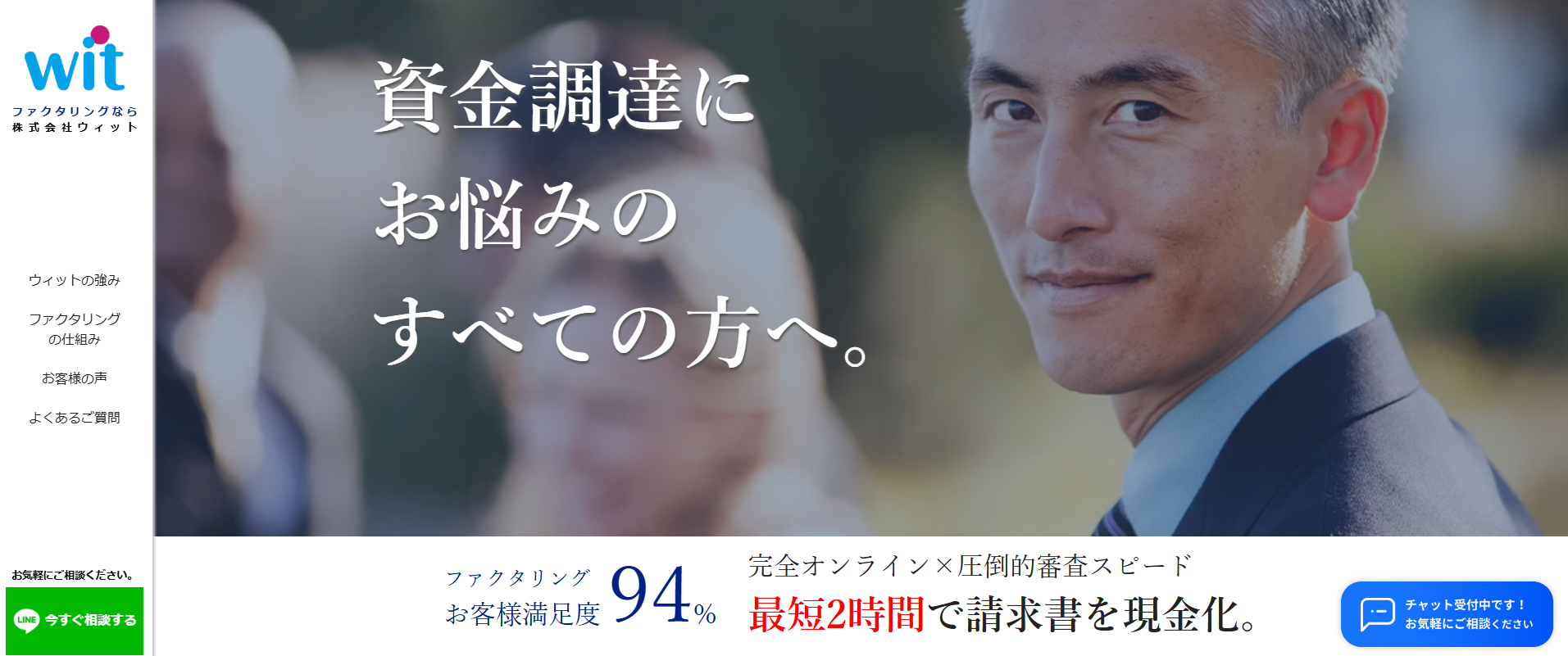 ウィットは中小企業に特化したファクタリング会社として、請求書だけでなく注文書でも資金調達に対応します。完全オンライン手続きでスマホから簡単に申し込めて、全国どこからでも利用できます。