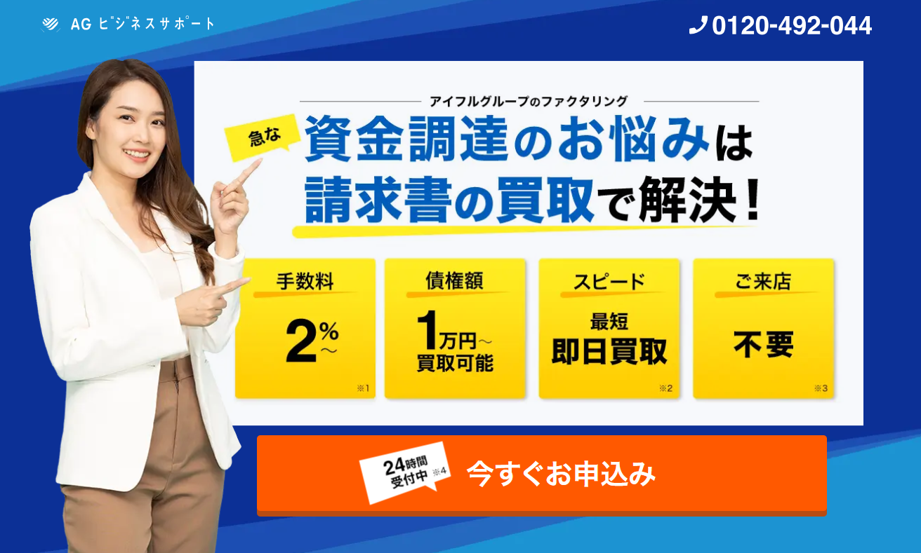 AGビジネスサポートのファクタリングは、アイフルグループのサービスです。1万円〜利用でき、手数料は2%〜12%の範囲で、請求書を最短即日で資金化することが可能です。