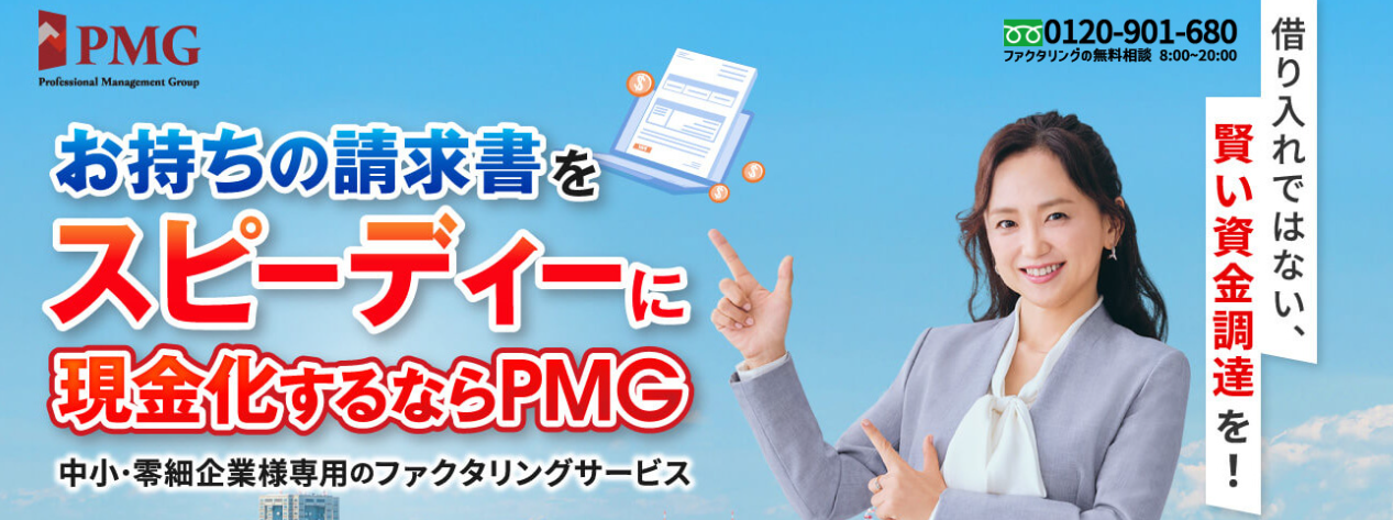 | PMG(ピーエムジー) | 2社間・3社間 | 1%〜10% | 最短2時間 | 50万円〜2億円程度 | PMG(ピーエムジー)公式HP |