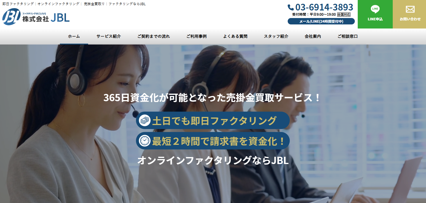 | 株式会社JBL | 2社間・3社間 | 2%〜14.9% | 最短2時間 | 〜1億円 | 株式会社JBL公式HP |