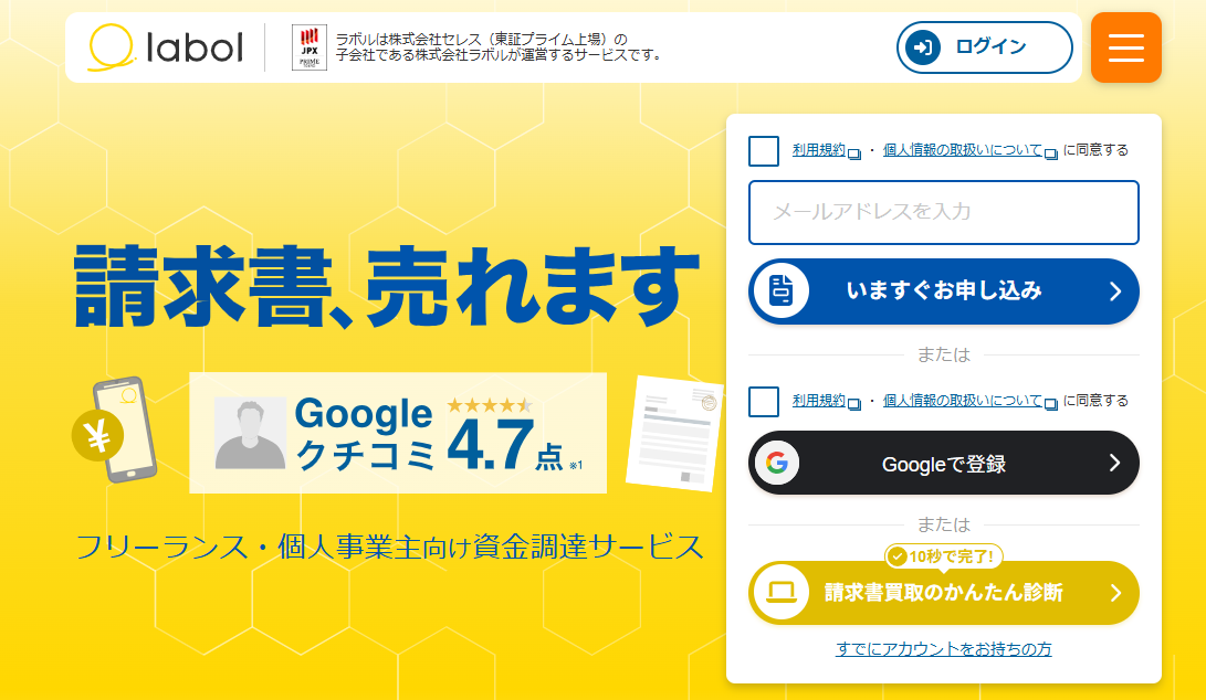 | ラボル | 2社間 | 10% | 最短30分 | 1万円〜 | ラボル公式HP |