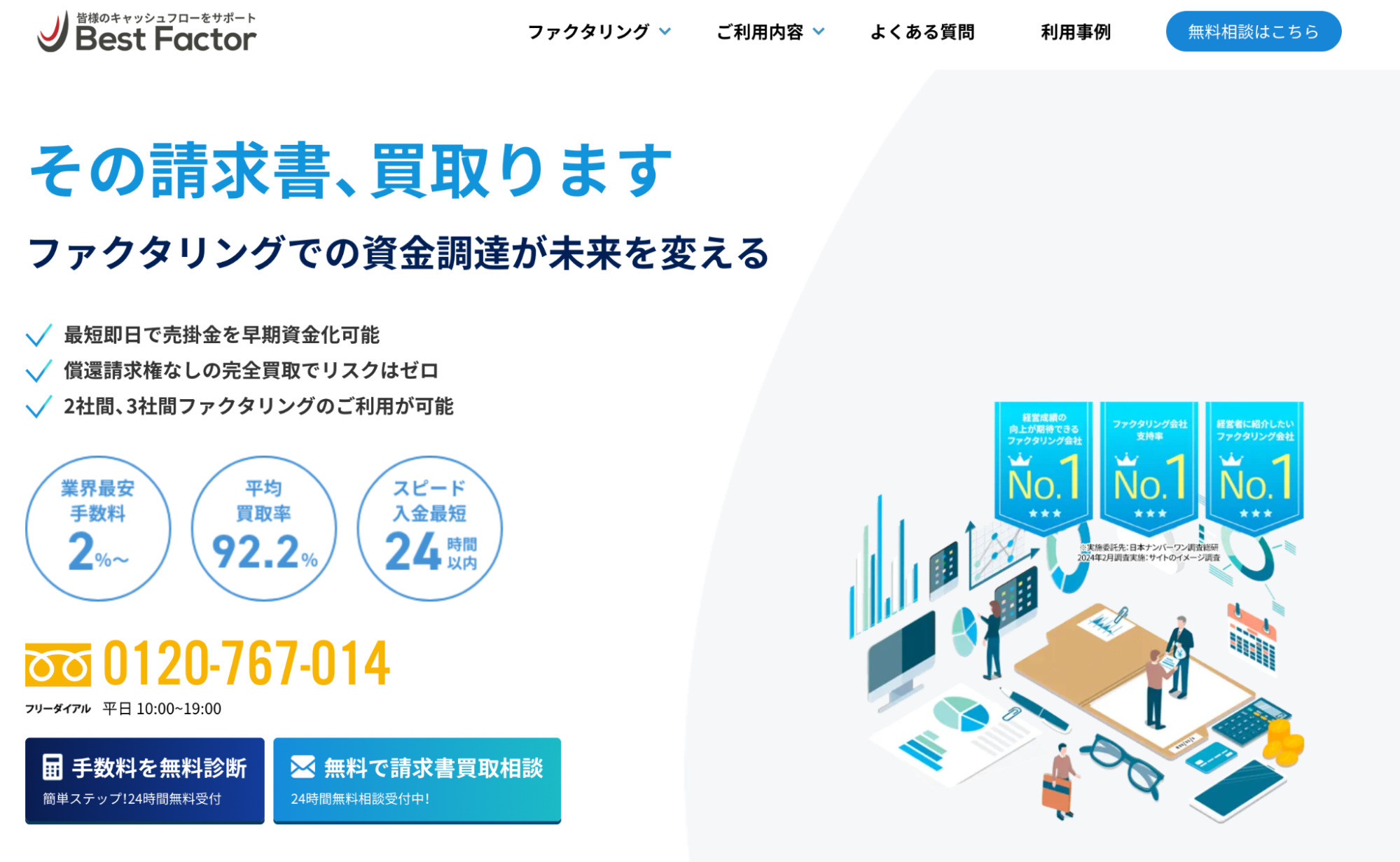 株式会社No.1は、スピーディーな対応と柔軟な契約条件に定評のあるファクタリング会社です。非対面での手続きにも対応しているため、場所や時間に制約されず、全国どこからでも申し込みが可能です。