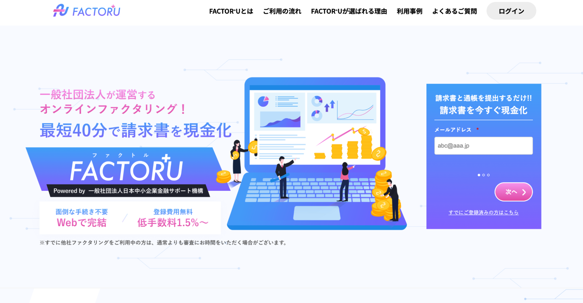 | ファクトル | 非公開 | 1.5%〜 | 最短40分 | 非公開 | ファクトル公式HP |