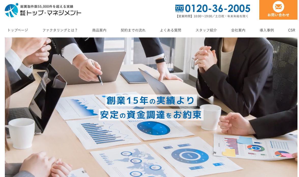 | トップ・マネジメント | 2社間・3社間 | 0.5%〜12.5% | 最短即日 | 〜1億円 | トップ・マネジメント公式HP |