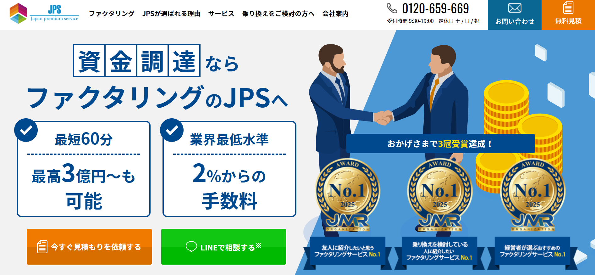 | JPS | 2社間・3社間 | 2%〜 | 最短60分 | 〜3億円 | JPS公式HP |