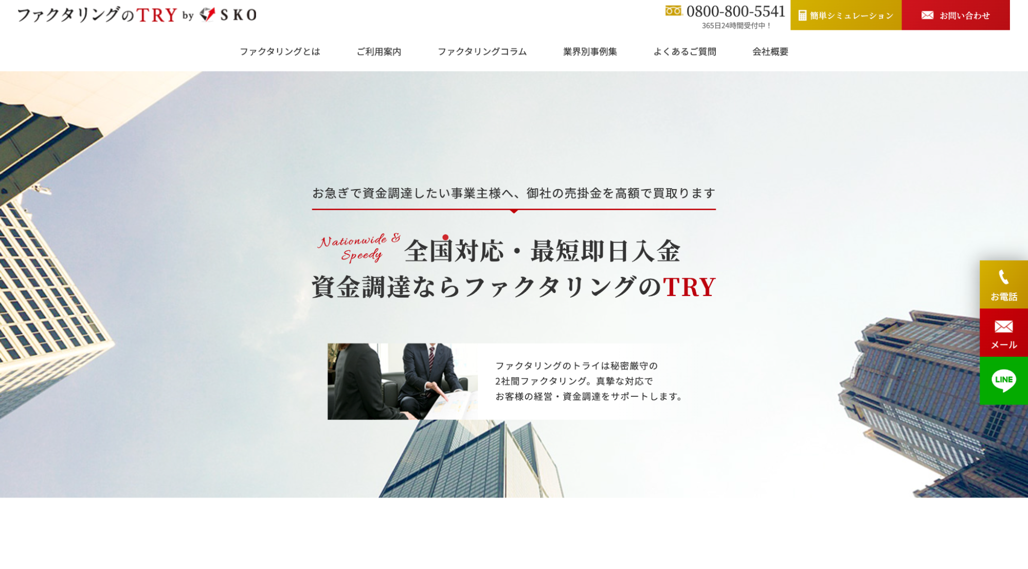 TRY(トライ)は、完全非対面で最短即日の資金調達ができる会社です。手続きはオンラインで完結します。個人事業主や中小企業を対象に、2社間ファクタリングを活用しています。