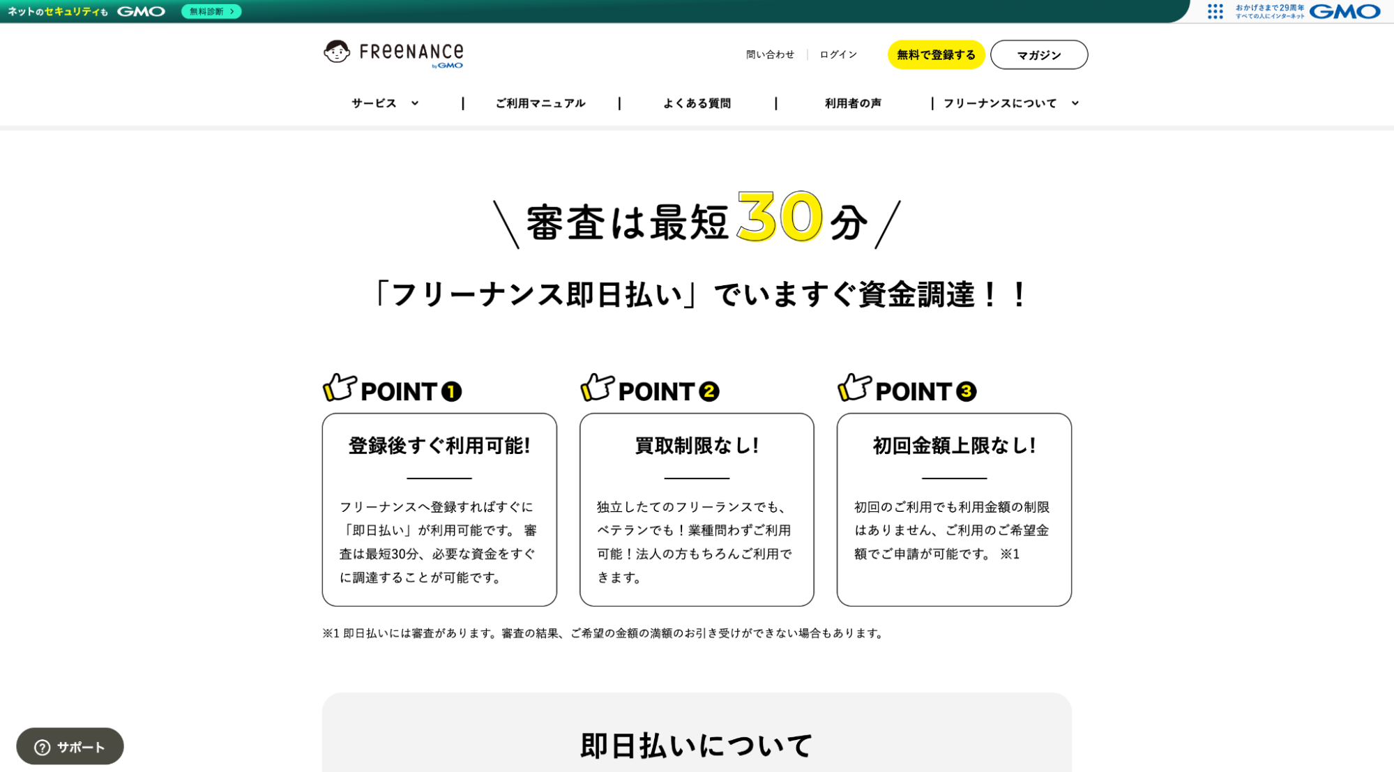 フリーナンスは、GMOクリエイターズネットワークが実施するフリーランス・個人事業主向けの即日で対応してくれるファクタリングサービスです。請求書をオンラインで提出するだけで、最短即日入金が完了します。