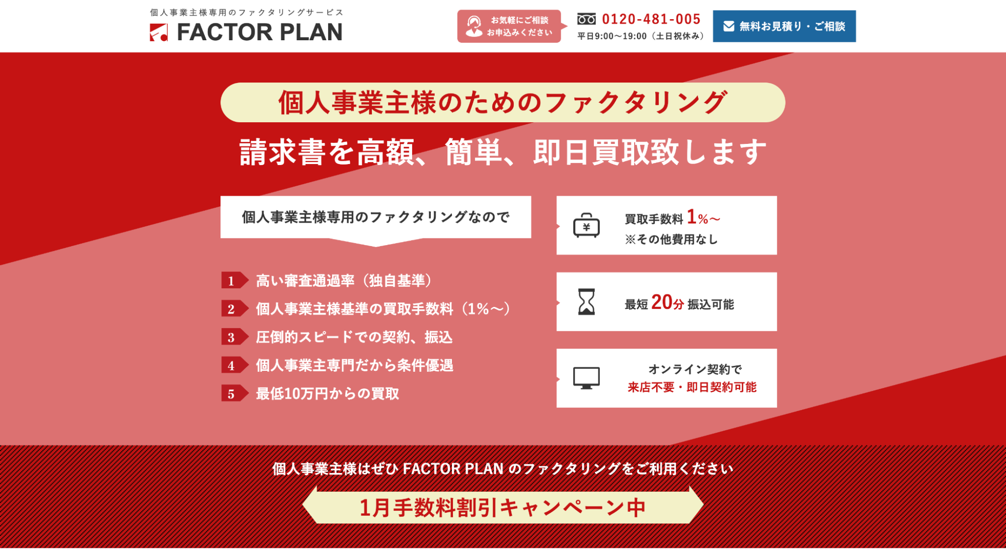| FACTORPLAN | 2社間 | 1%〜 | 最短即日20分 | 10万円〜 | FACTORPLAN公式HP |