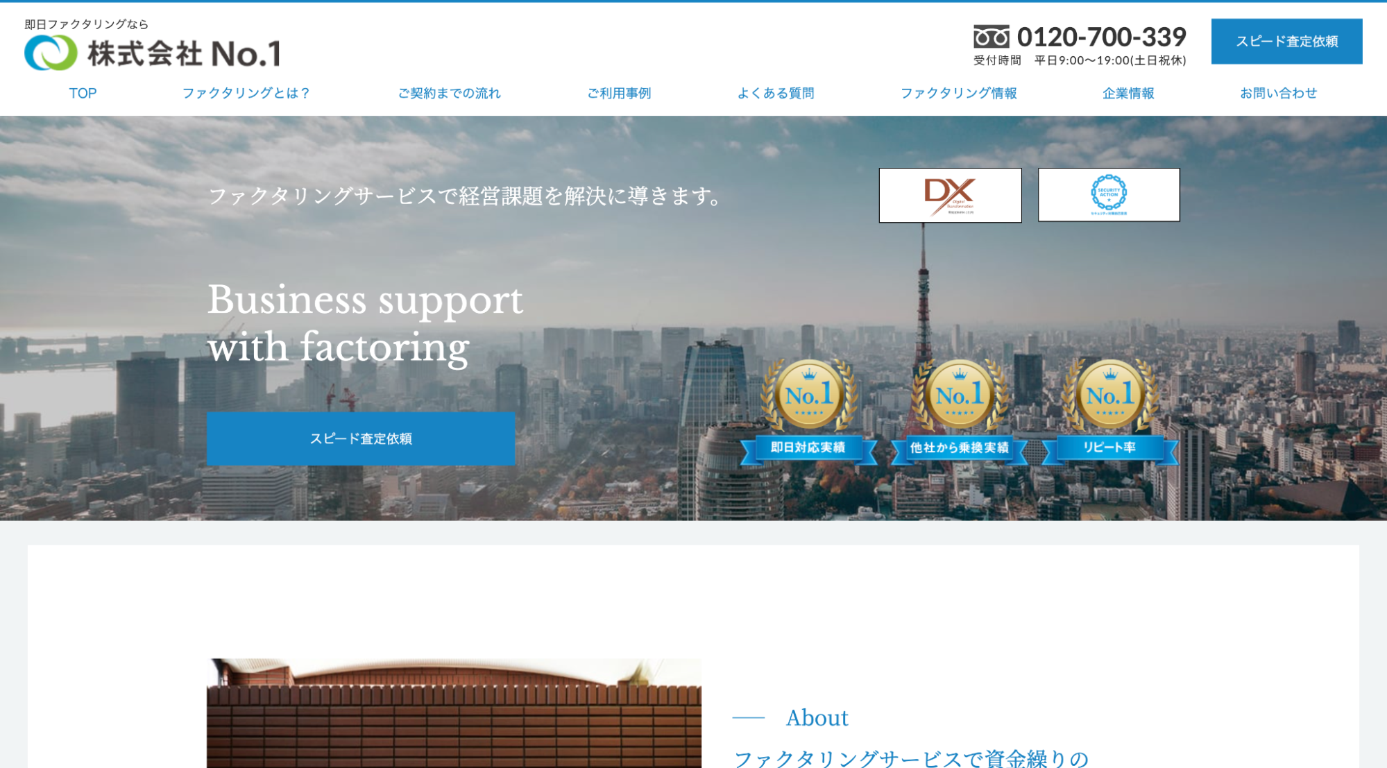 | 株式会社No.1 | 2社間・3社間 | 非公開 | 最短即日 | 非公開 | 株式会社No.1公式HP |
