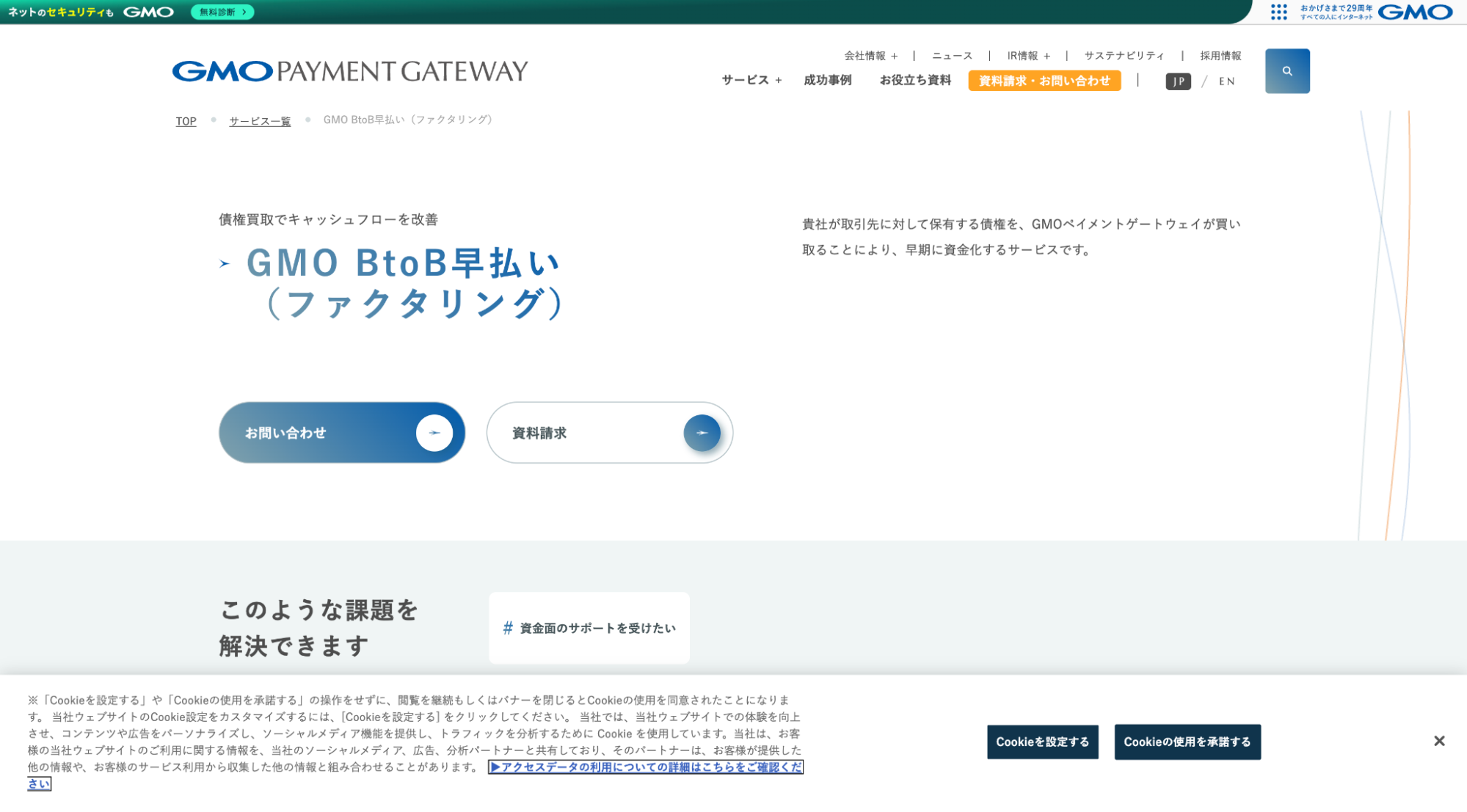 GMO BtoB早払いは、GMOペイメントゲートウェイが実施する法人向けのサービスです。請求書を最短2営業日で現金化でき、東証プライム上場企業による運営で信頼性が高く、手数料も明確です。