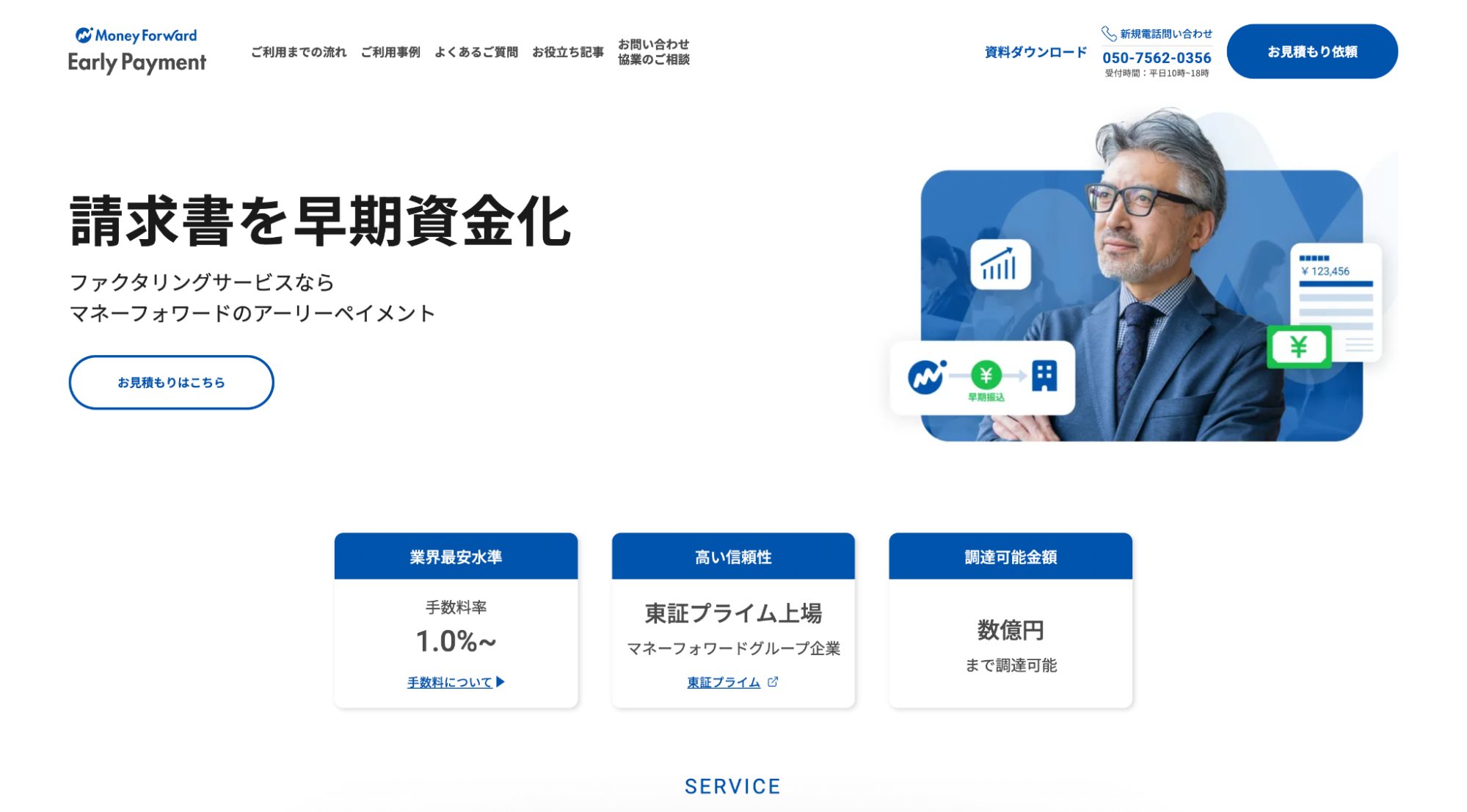 マネーフォワードアーリーペイメントは、上場企業マネーフォワードが実施する企業向けのサービスです。請求書を最短2営業日で現金化でき、オンラインで申請から入金まで完結します。