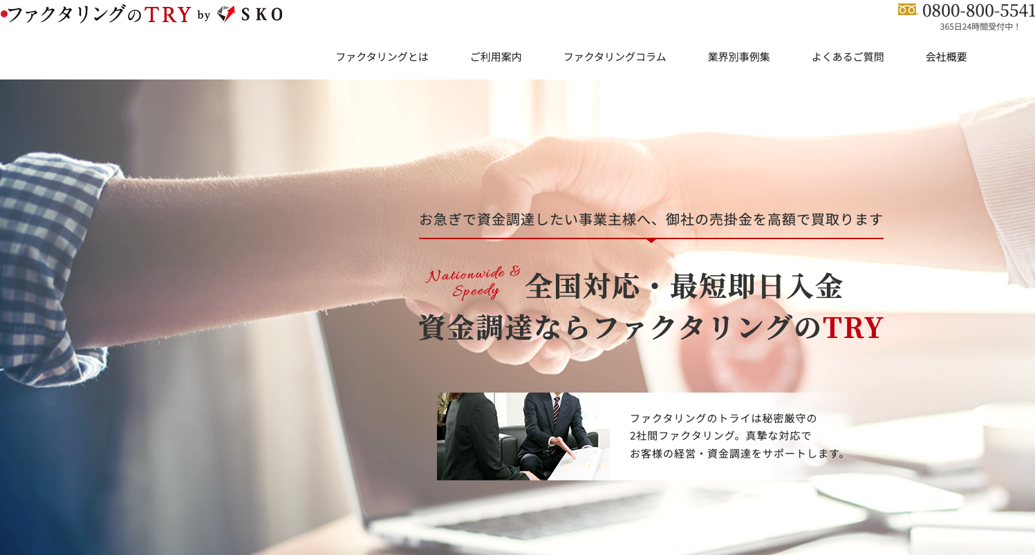 TRYは、2社間ファクタリングに特化したサービスを展開しています。秘密厳守での資金調達を重視する経営者に最適なファクタリング会社です。売掛先に通知されることなく、スピーディに現金を手にできます。