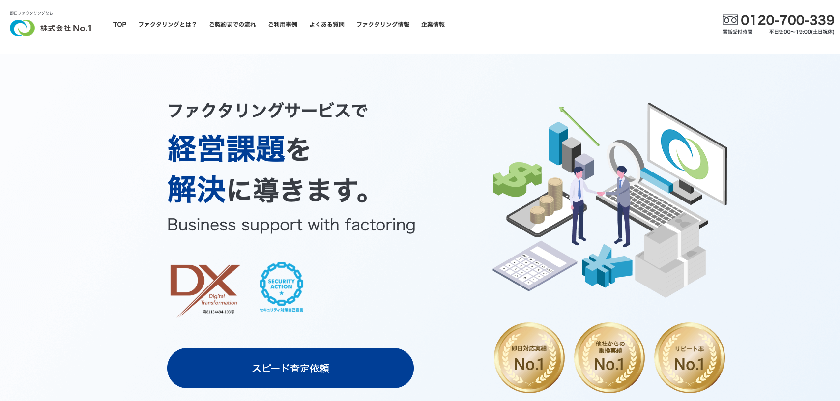 | 株式会社No.1 | 2社間・3社間 | 1%〜15% | 最短30分 | 20万円〜1億円 | 株式会社No.1公式HP |