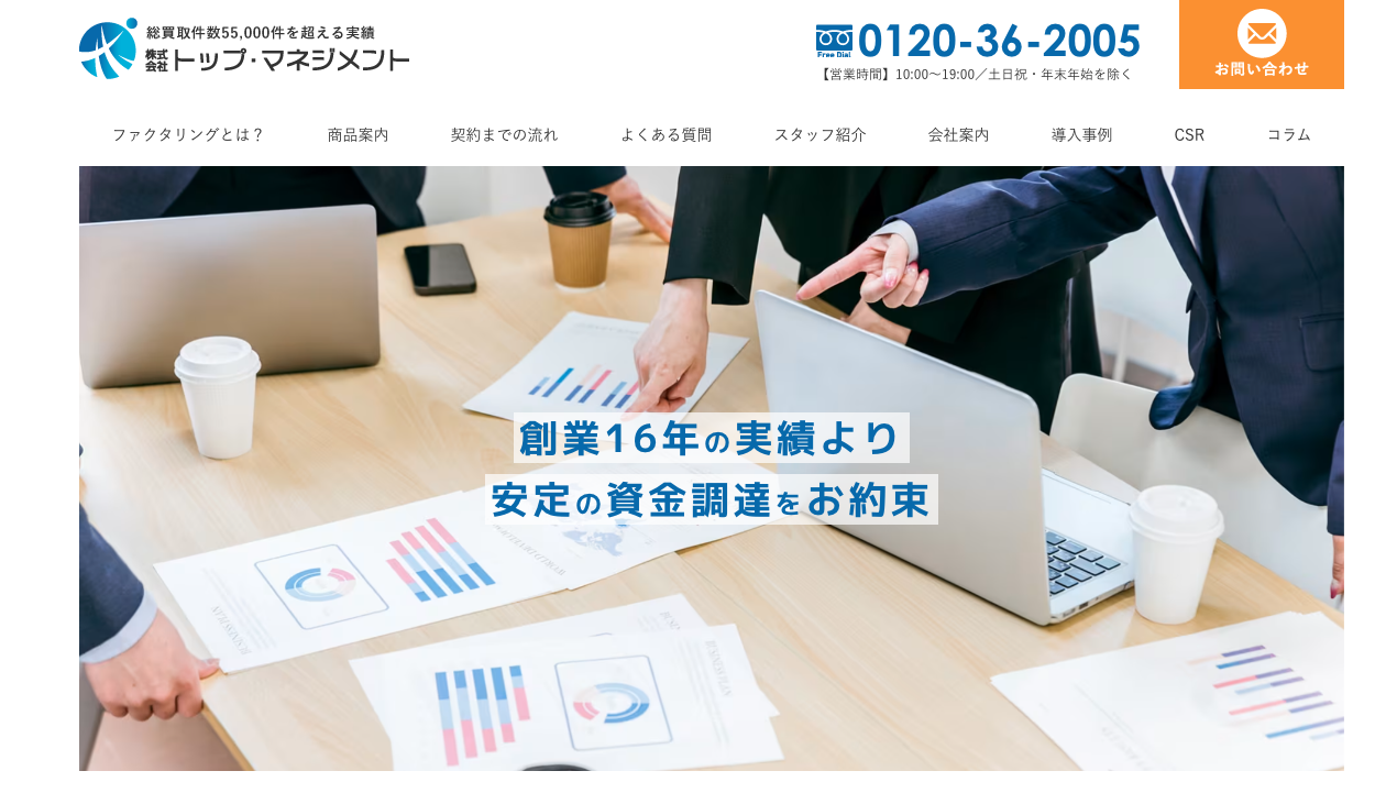 | トップ・マネジメント | 2社間・3社間 | 2社間:3.5%〜3社間:0.5%〜 | 非公開 | 非公開 | トップ・マネジメント公式HP |
