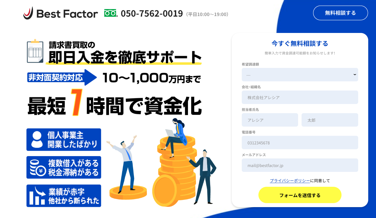ベストファクターは、最短1時間で資金化まで完了できるスピード感が強みのファクタリングサービスです。業界最安水準の2%〜手数料が設定されており、コストを抑えたい経営者に適しています。