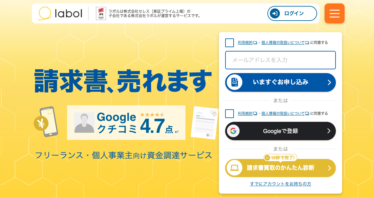 | ラボル | 2社間 | 10% | 最短30分 | 1万円〜 | ラボル公式HP |