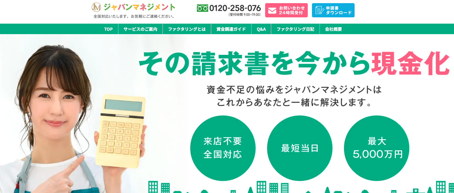 | ジャパンマネジメント | 2社間・3社間 | 非公開 | 最短即日 | 〜5,000万円 | ジャパンマネジメント公式HP |