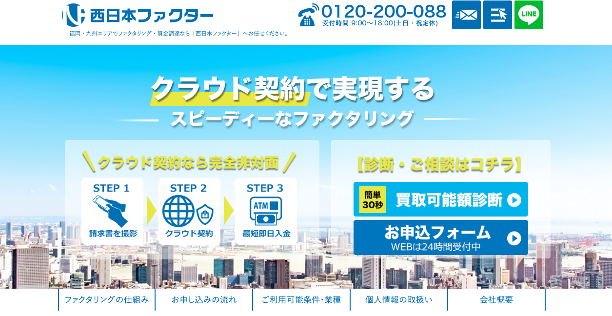 | 西日本ファクター | 2社間・3社間 | 非公開 | 最短即日 | 〜3,000万円 | 西日本ファクター公式HP |