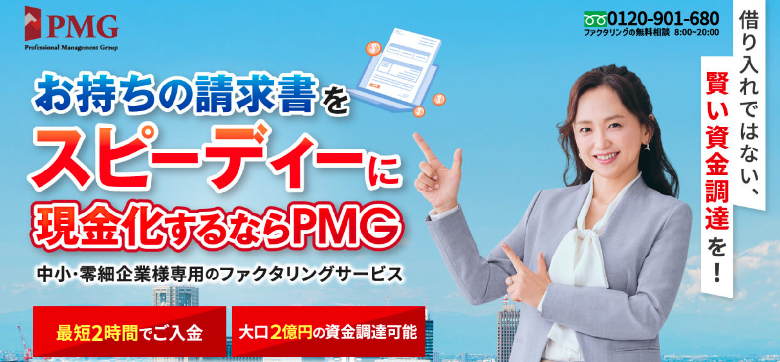 PMGは、迅速な審査と幅広い対応力が魅力の大手ファクタリング会社です。建設業や運送業、製造業などの企業に幅広く利用されています。