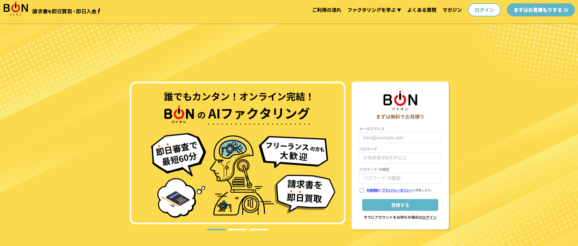 | バイオン | 2社間 | 10% | 最短即日 | 5万円〜 | バイオン公式HP |