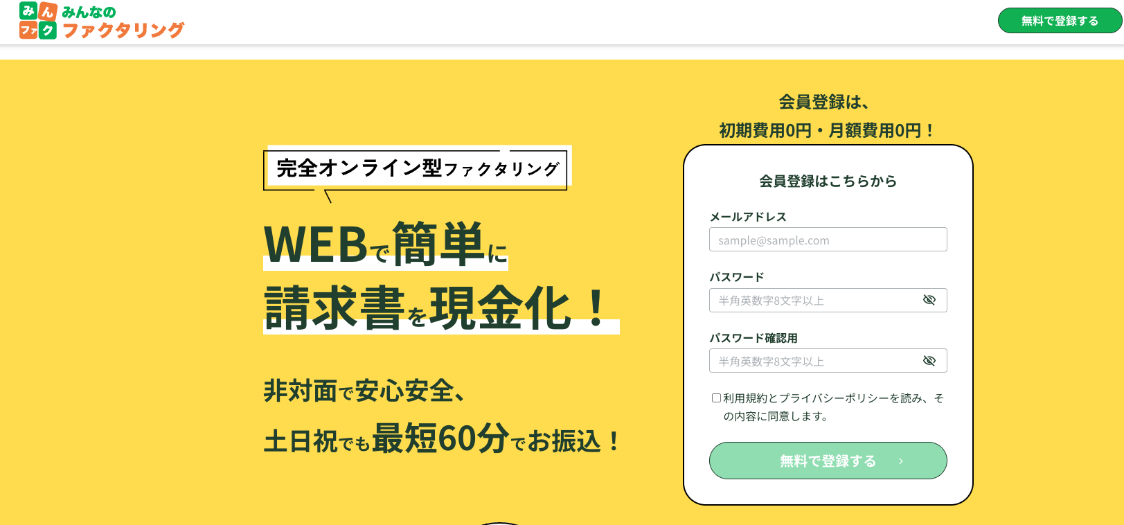 | みんなのファクタリング | 2社間 | 非公開 | 最短60分 | 非公開 | みんなのファクタリング公式HP |