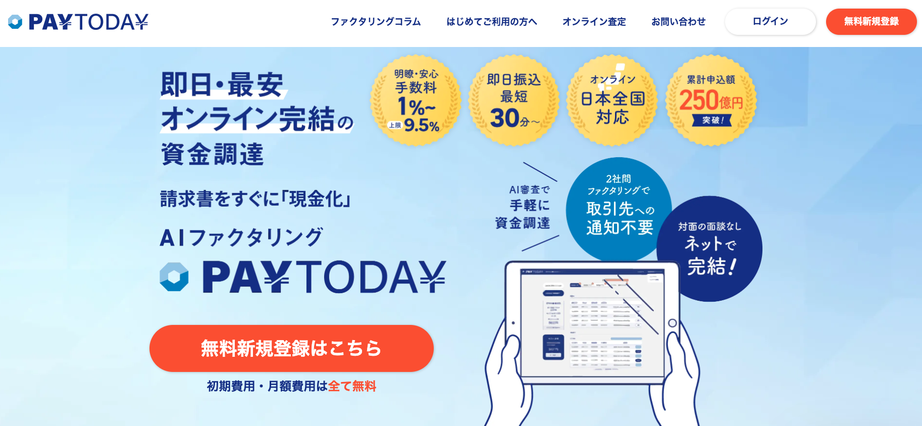 | PAYTODAY | 2社間 | 1%〜9.5% | 最短30分 | 10万円〜 | PAYTODAY公式HP |