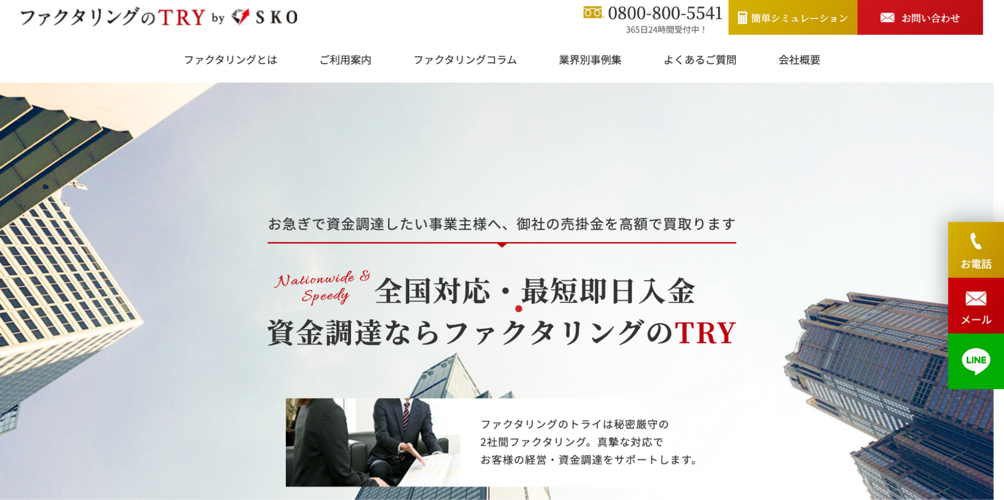 | TRY | 2社間 | 3%〜 | 最短即日 | 10万円〜5,000万円 | TRY公式HP |