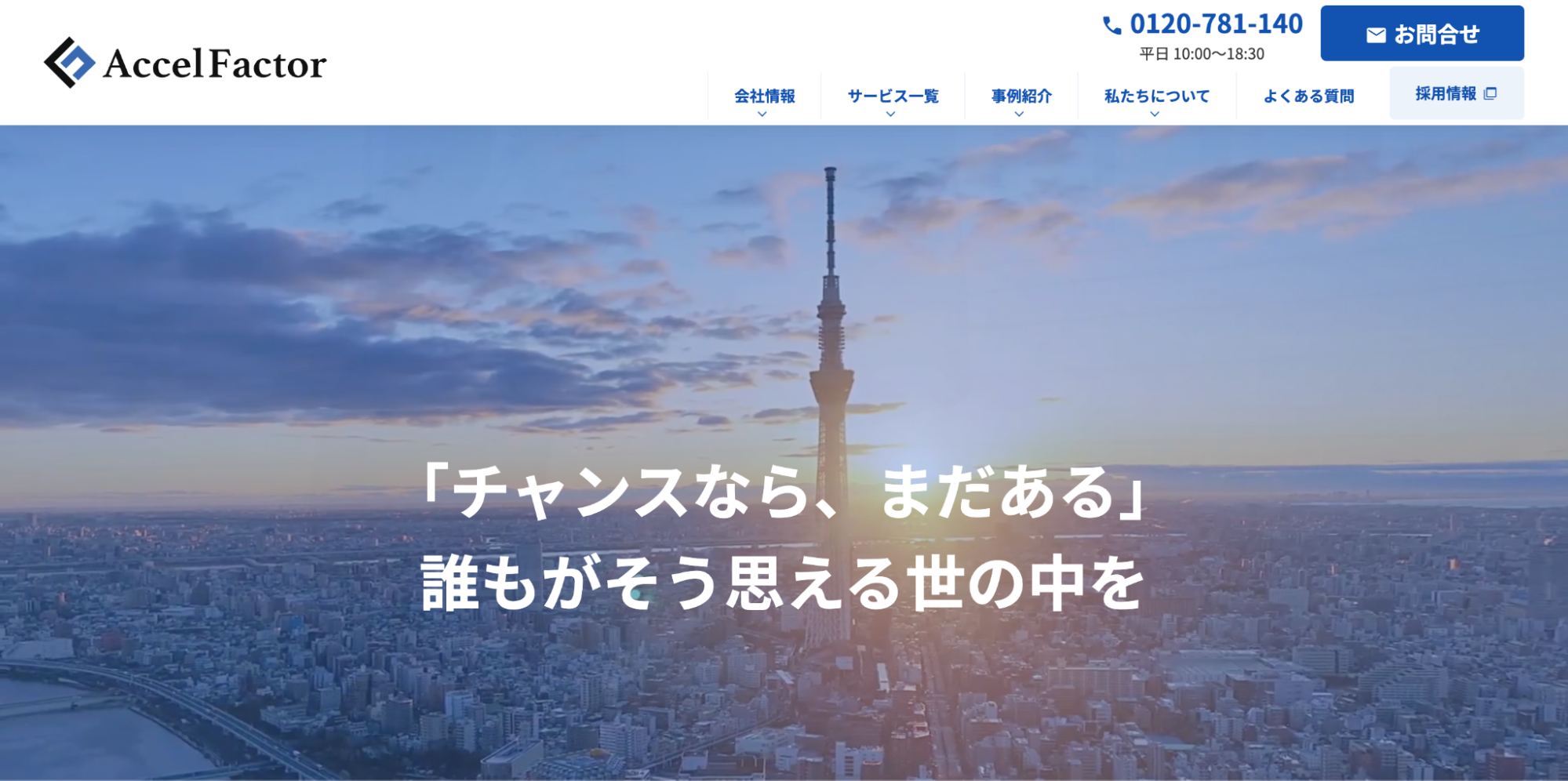 アクセルファクターは、高い審査通過率が強みです。利用者にとって最適な解決方法を提案するなど、親身で柔軟なサポート体制を売りにしているので、他社の審査に落ちた方でも高い通過率を誇ります。