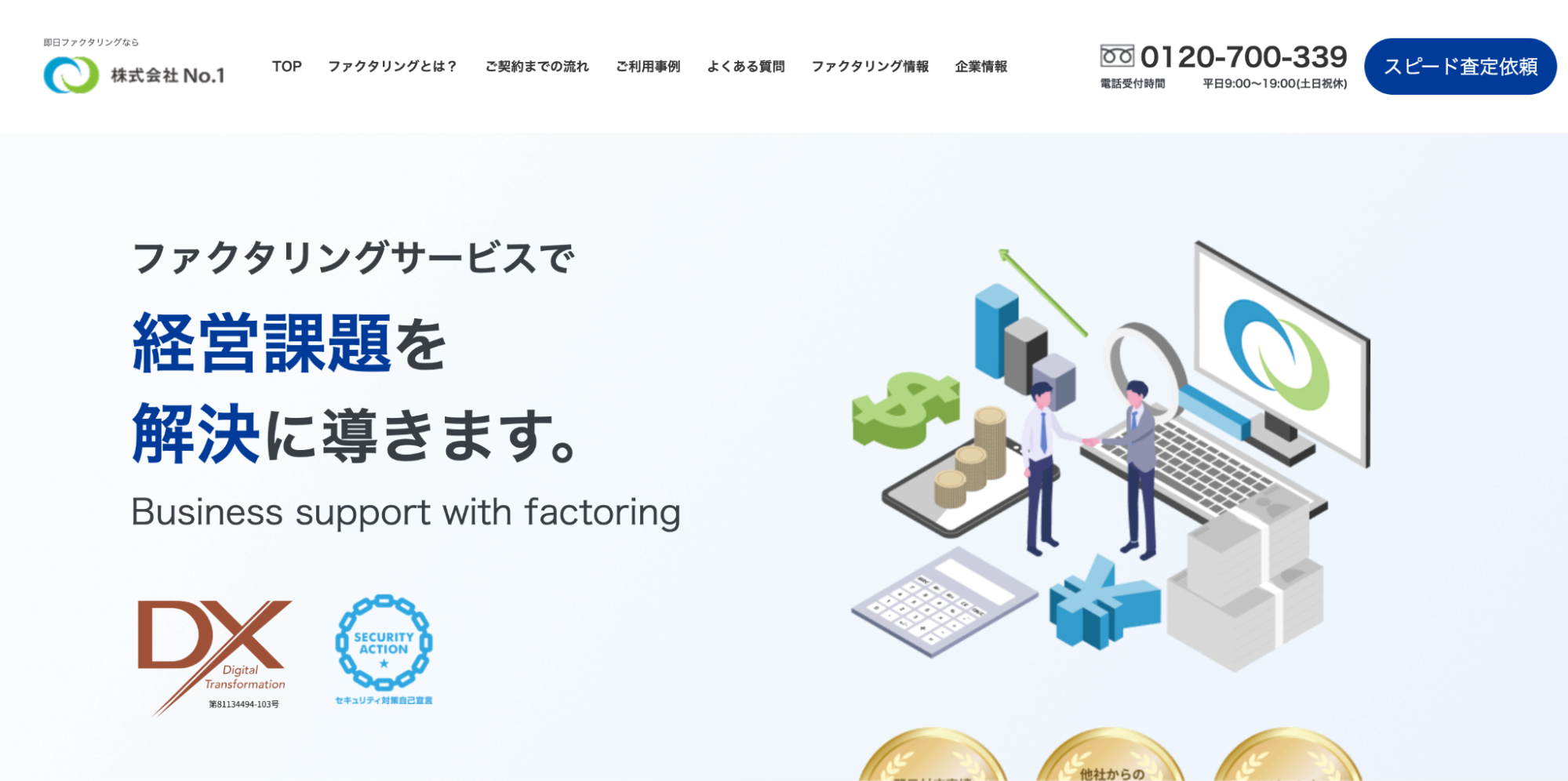 | 株式会社No.1 | 2社間 | 1%〜15% | 最短即日 | 20万円〜1億円 | 株式会社No.1公式HP |